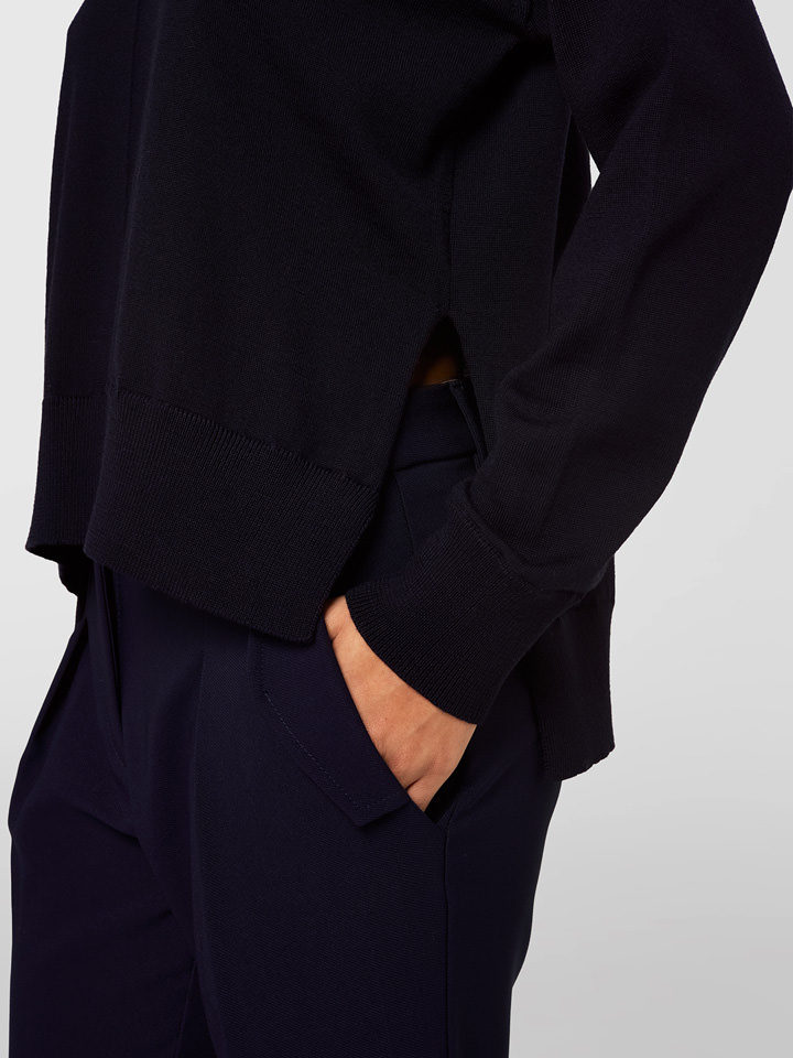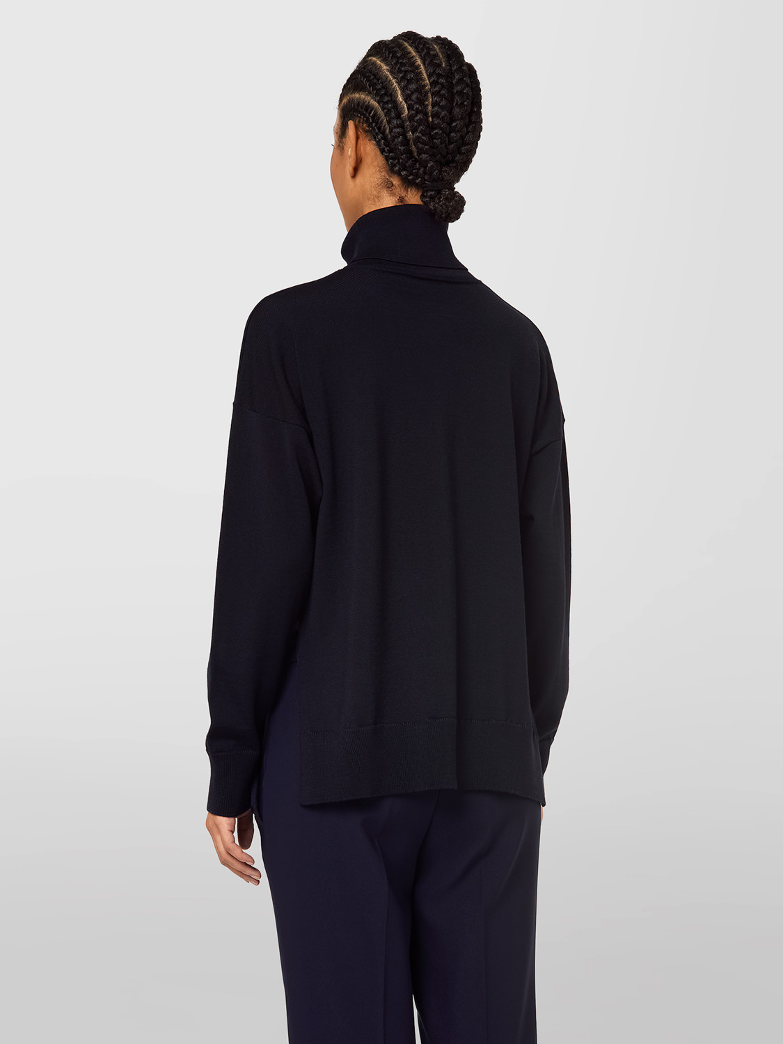 Col roulé en laine mérinos couleur unie. Manches longues avec épaule légèrement tombée. Poignets et bas de la chemise à petites cotes. Fond asymétrique avec dos plus long et fentes latérales. Ajustement régulier.