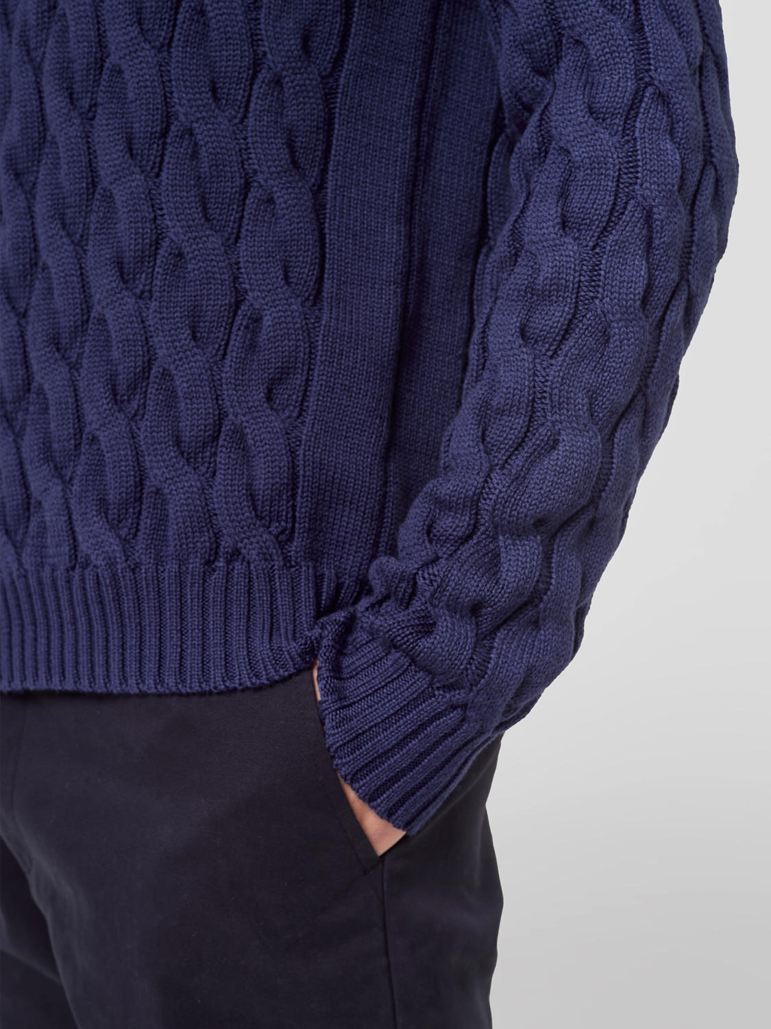 Cycliste en mérinos de couleur unie avec tresse allover. Col bas de chemise et poignets en côtes moyennes. Ajustement régulier.